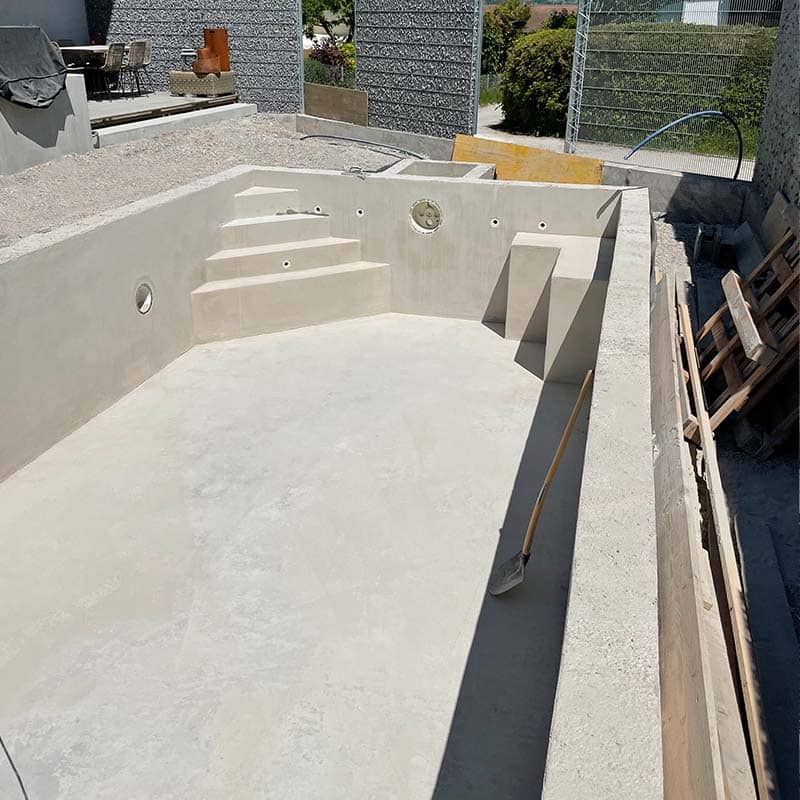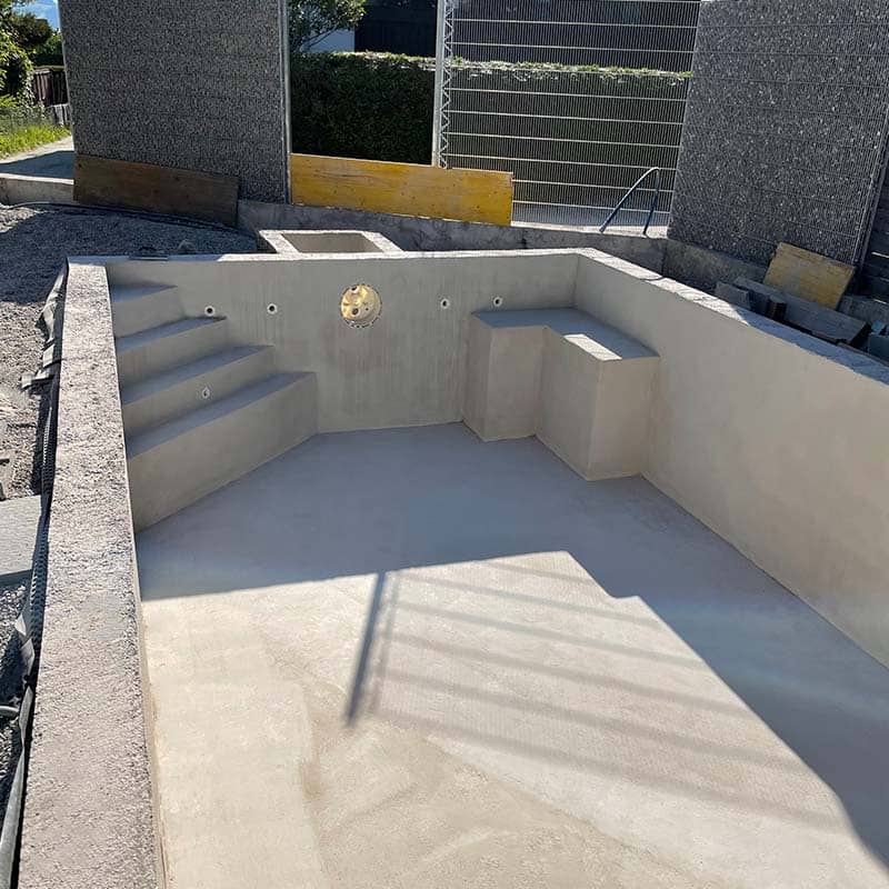 Im Inneren sorgt Bewährungsstahl (Metallgitter), der durch Beton geschlossen wird, durch langfristige Stabilität, die den Zug- & Druckkräften eines solchen Bauwerks Stand hält. Solche Schalungssteine haben gleichzeitig eine isolierende Wirkung, die mit entsprechenden Vorteilen für einen Swimmingpool einhergehen. Auch eine passende Verrohrung wurde von uns angefertigt.
