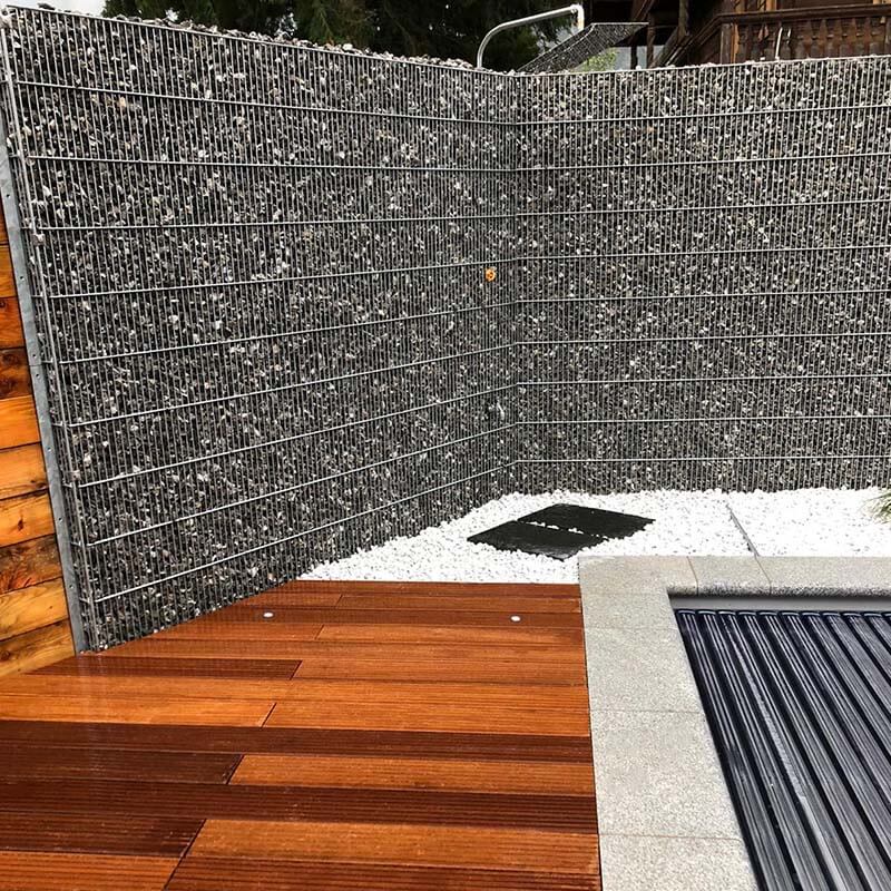 Auch wurde gewünscht, dass es eine Edelstahl-Dusche im Außenbereich geben soll (neben dem Pool; über den beiden großen schwarzen Flächen aus Stein) und zur visuellen Abgrenzung zu anliegenden Grundstücken eine Gabione. Auch hier sollten dieselben Materialien genutzt werden, die bereits im Garten vorhanden waren.